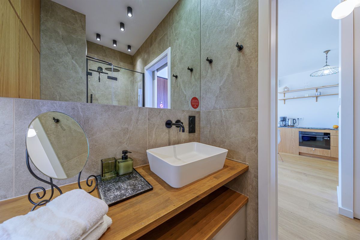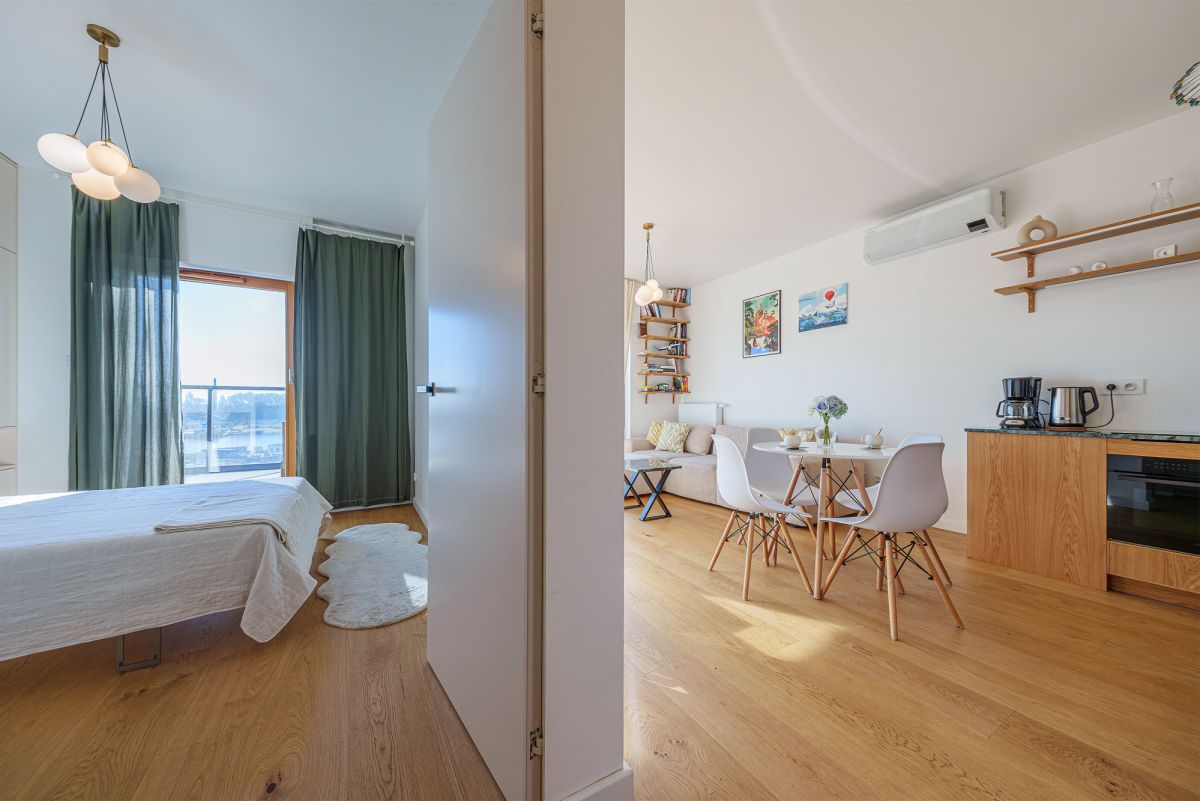 Wnętrza zostały gustownie zaprojektowane z dbałością o detale - dominują naturalne materiały i nowoczesne oświetlenie, co tworzy harmonijną i przytulną atmosferę. Apartament jest w pełni umeblowany i wyposażony.