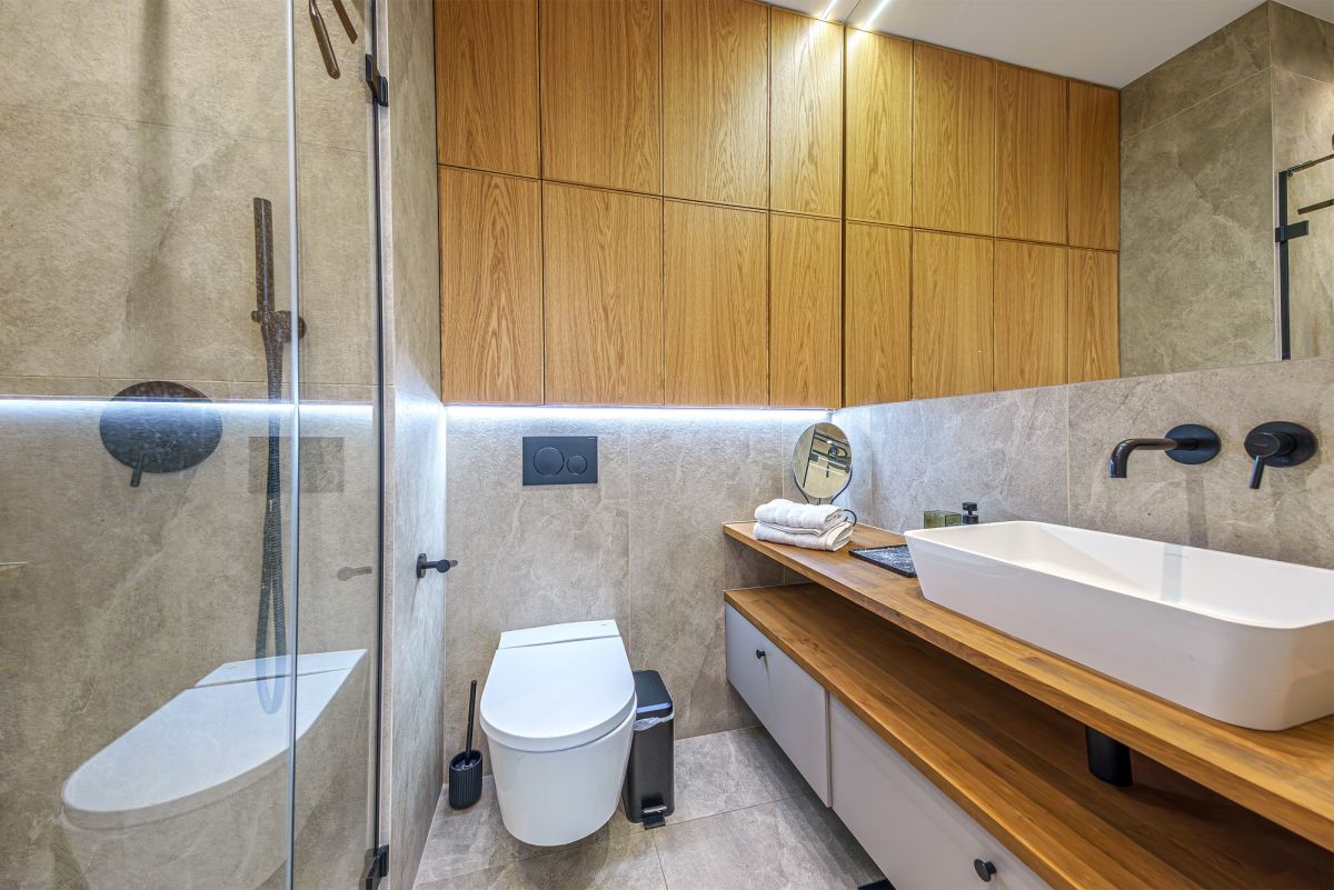 - eleganckiej łazienki z prysznicem typu walk-in;