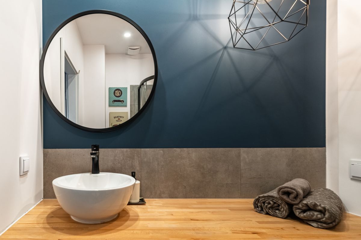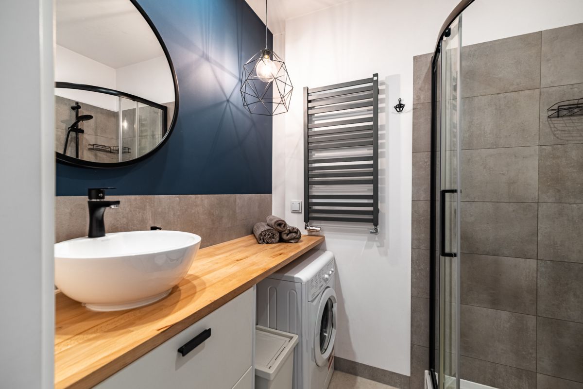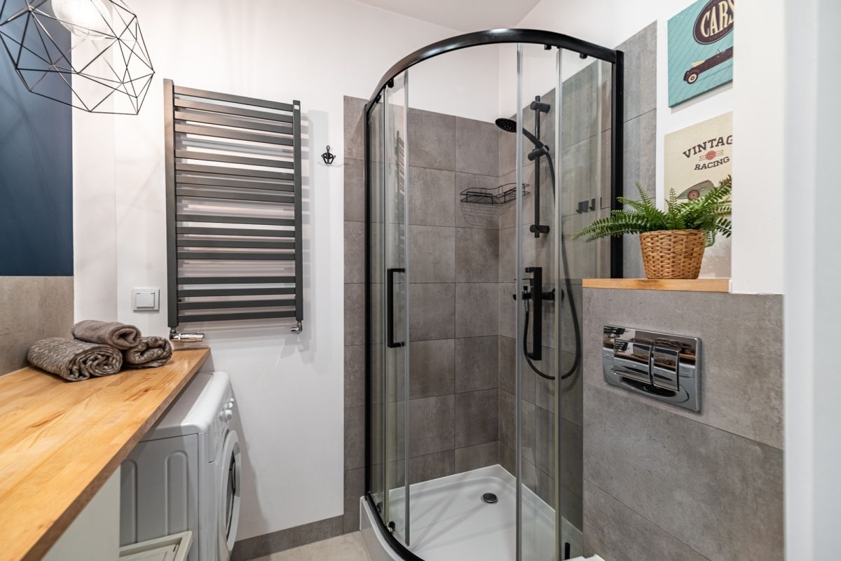 - Nowoczesnej łazienki z prysznicem oraz miejscem na pralkę