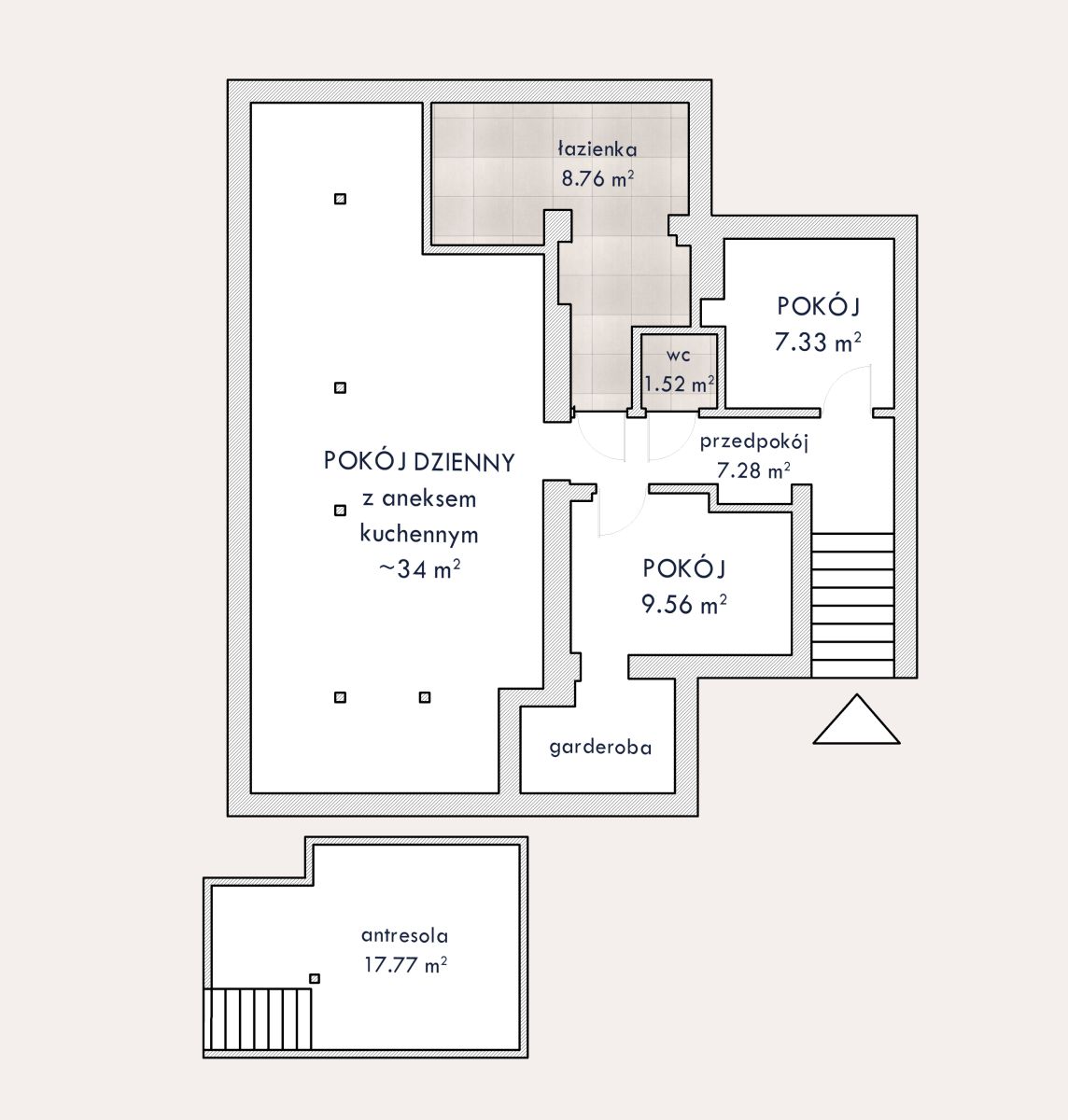 - Powierzchnia poddasza (nieujęta w metrażu mieszkania): 13,71 m²