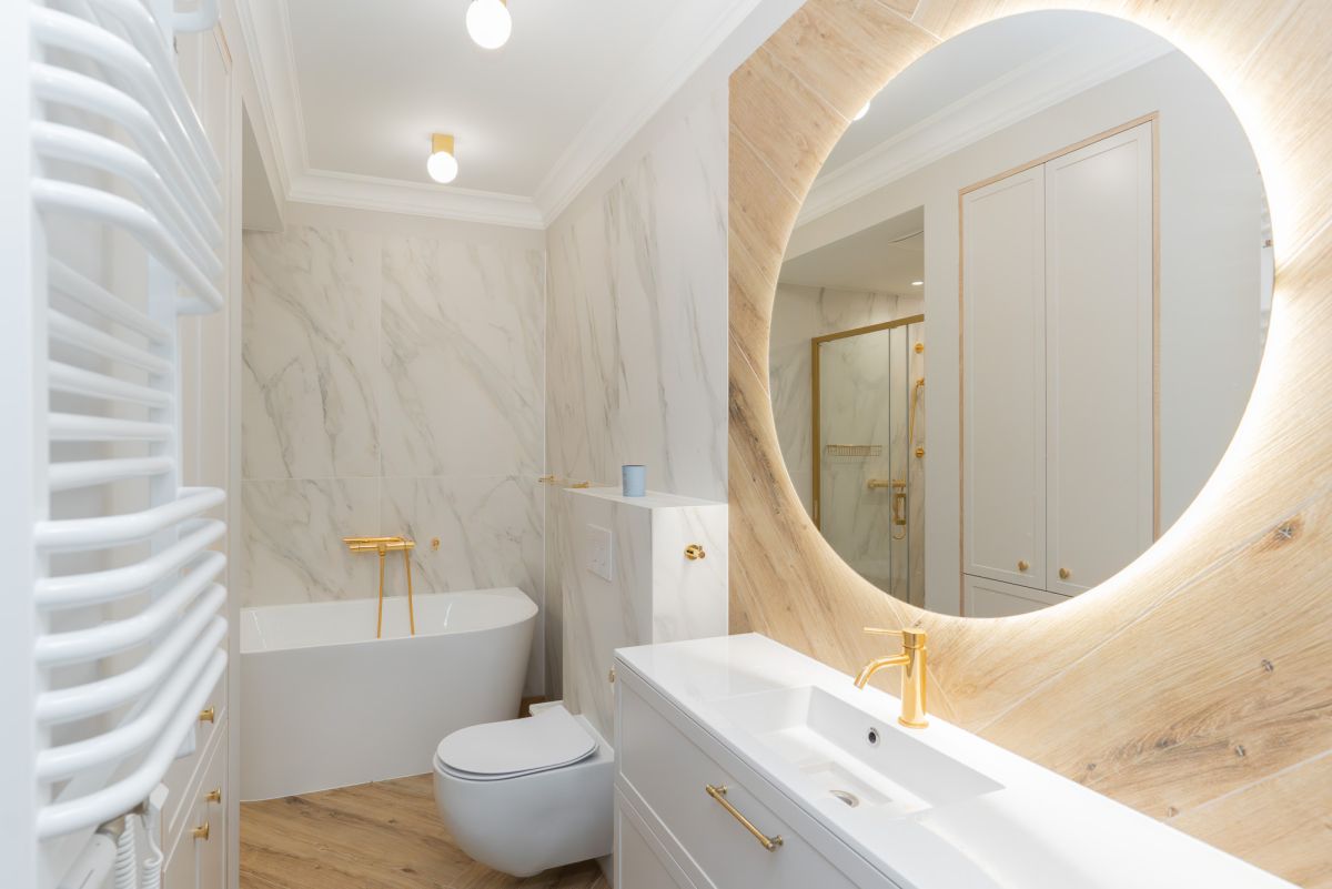 Wykończenia imitujące marmur + naturalne struktury drewna.