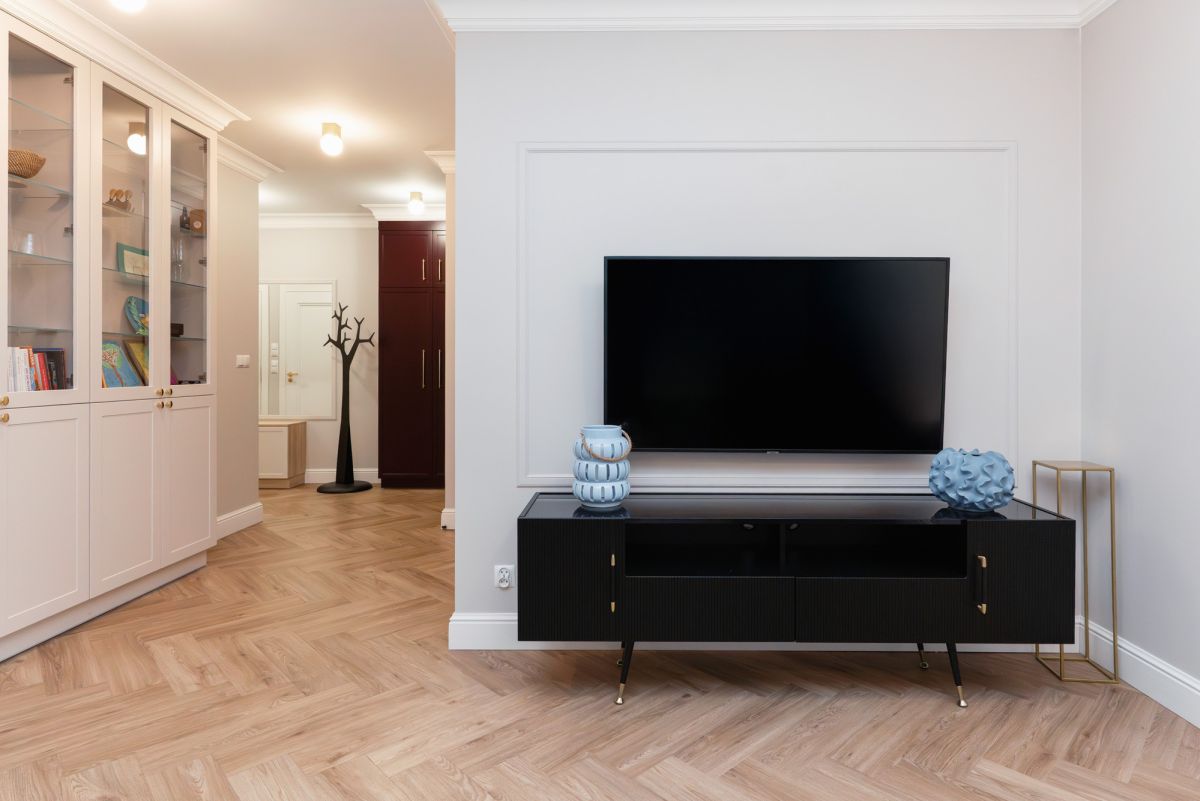 Nowoczesna zabudowa RTV + subtelne listwy dekoracyjne na ścianach