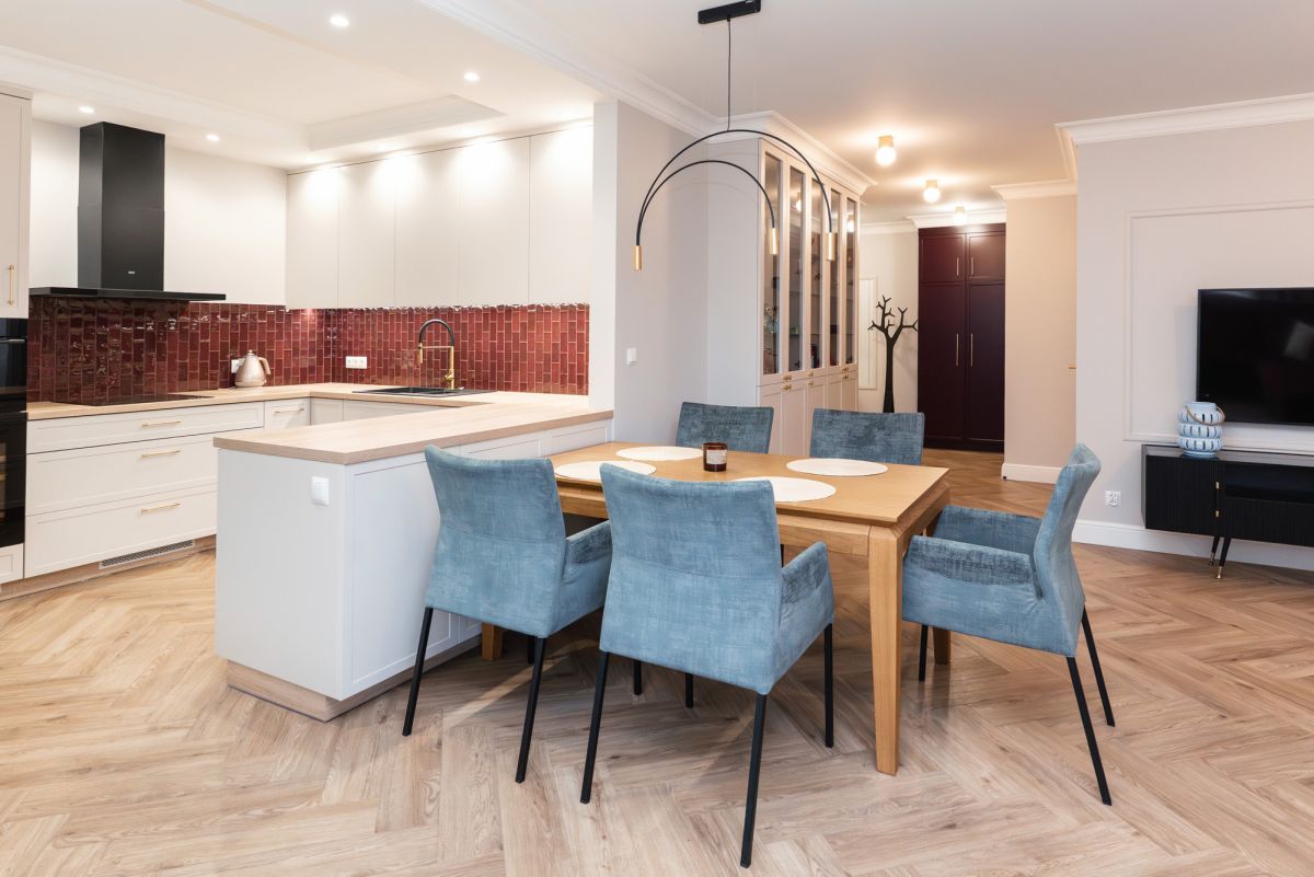 Otwarta przestrzeń łącząca kuchnię z jadalnią i salonem.
