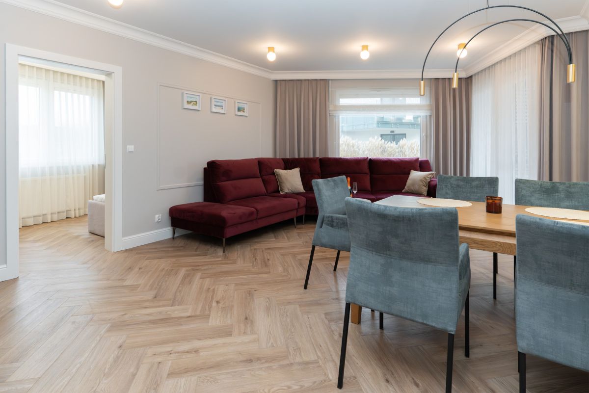 Winylowa wysokiej klasy podłoga w jodełkę nadająca wnętrzu prestiżu.