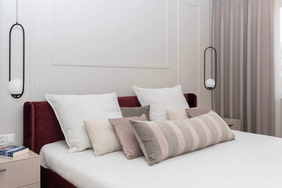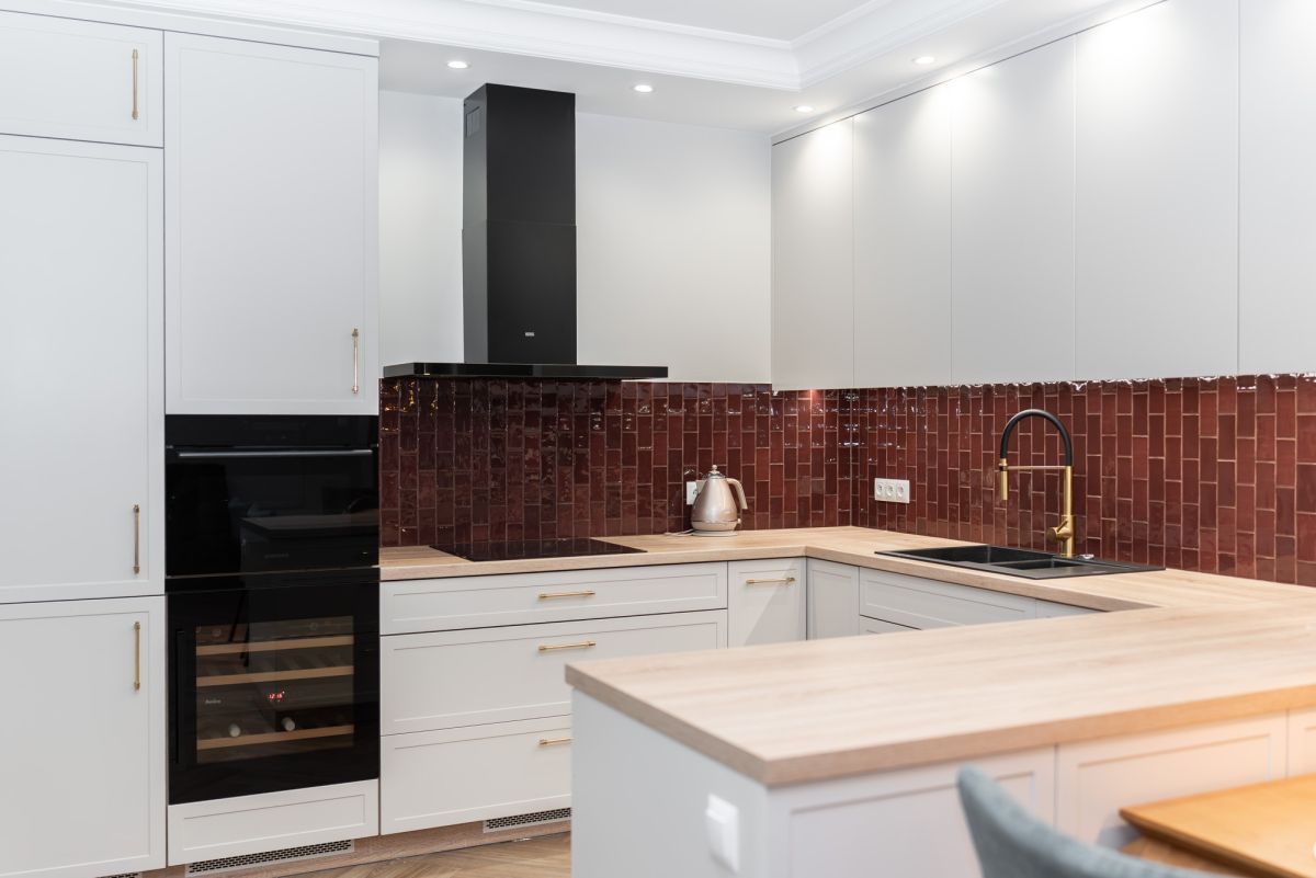 Stylowa, bordowa płytka między szafkami dodaje całości charakteru.