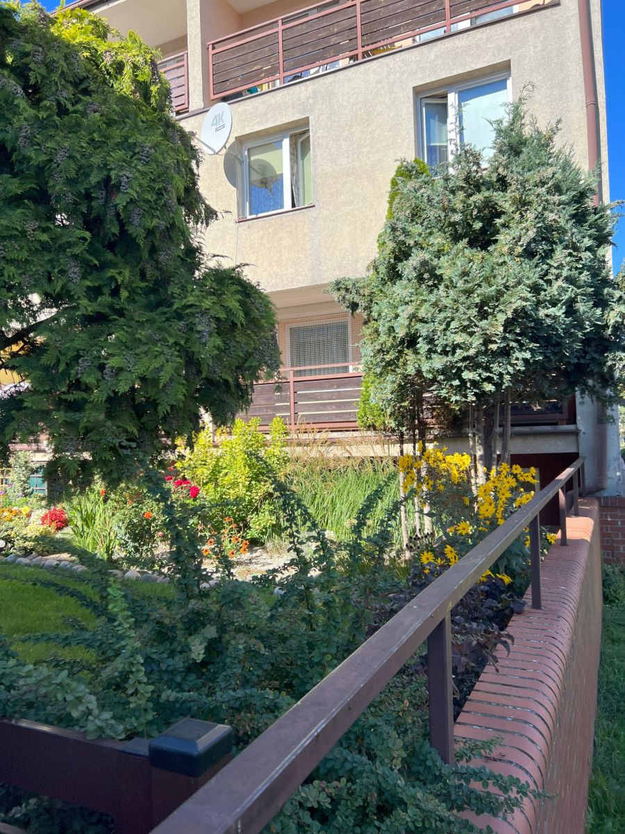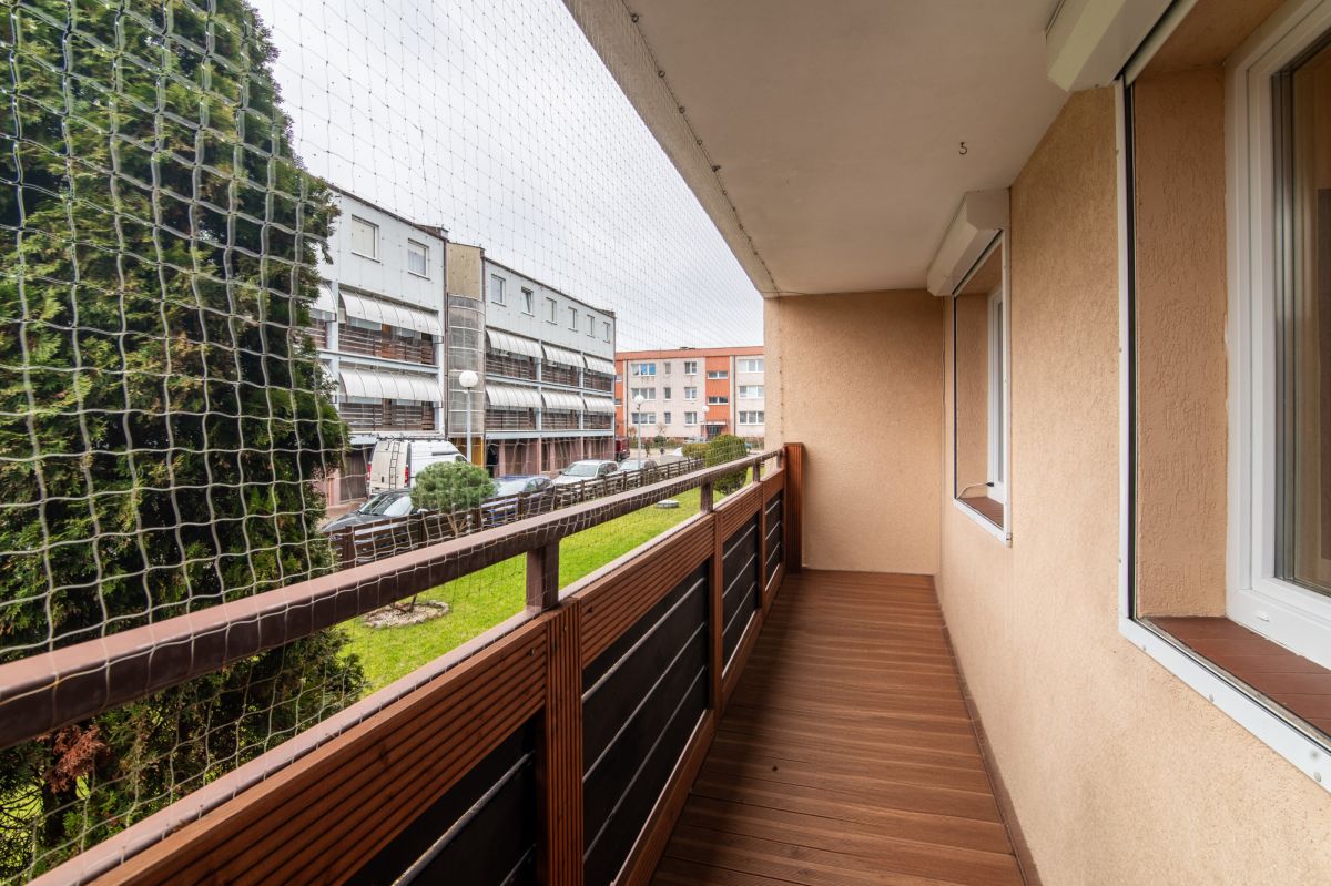 duży, słoneczny balkon od strony południowej, z widokiem na ładnie zagospodarowany, przeznaczony do użytku właścicieli mieszkania,