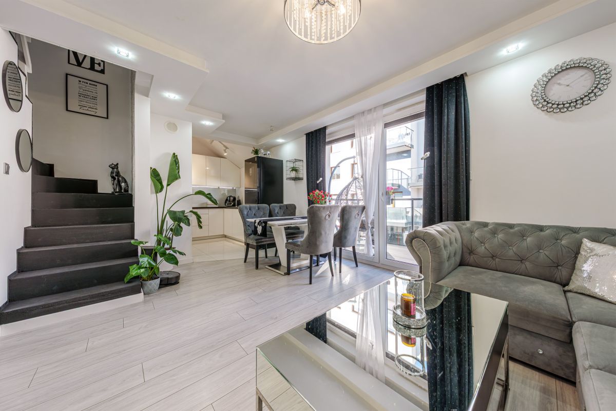 powierzchnię użytkową 97,5 m2 i składa się z dwóch poziomów na które prowadzi wewnętrzna, należąca do mieszkania klatka schodowa, z praktycznym schowkiem i szafą na ubrania wierzchnie.