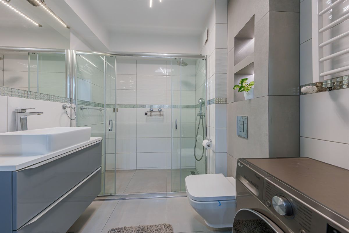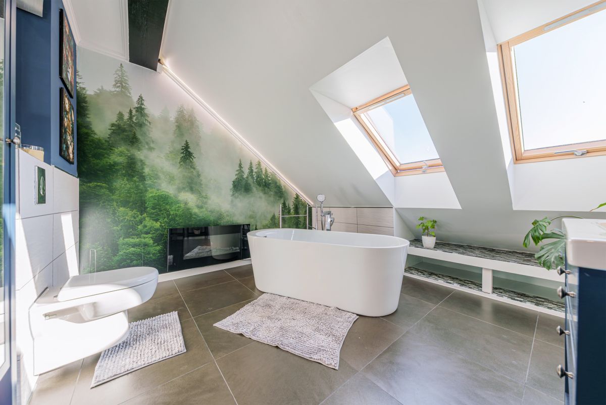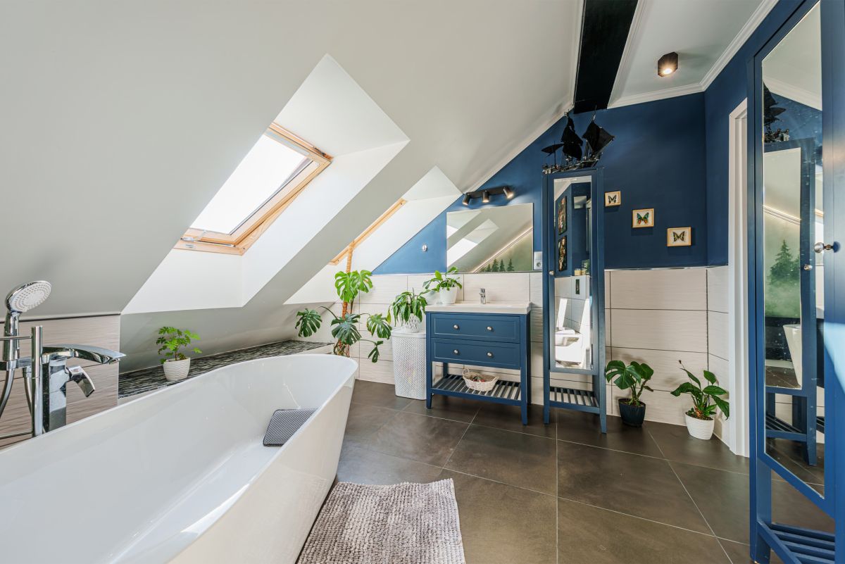 - łazienki nowoczesne, w naturalnych odcieniach - dolna łazienka z kabiną prysznicową, górna z wolnostojącą wanną;