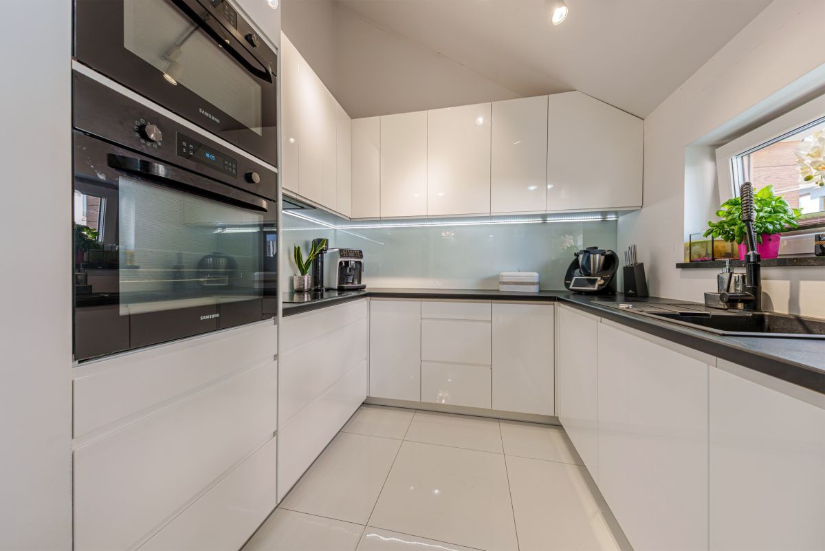 - kuchnia w białej zabudowie na wymiar, wyposażona w dobrej jakości sprzęt AGD (płyta indukcyjna, zmywarka, piekarnik, okap);