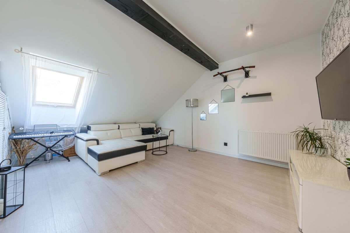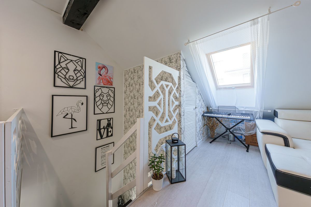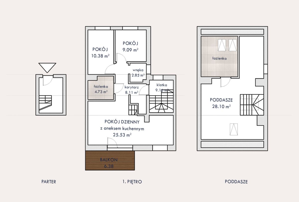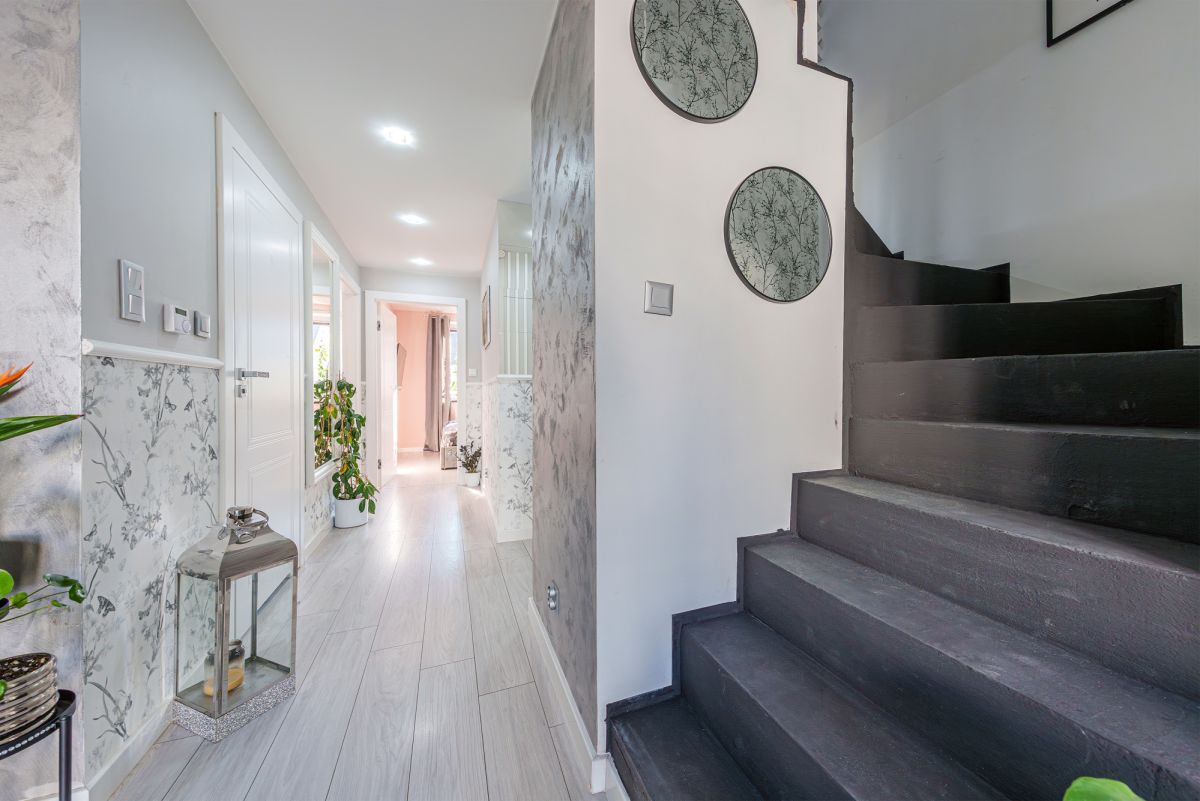 powierzchnię użytkową 97,5 m2 i składa się z dwóch poziomów na które prowadzi wewnętrzna, należąca do mieszkania klatka schodowa, z praktycznym schowkiem i szafą na ubrania wierzchnie.