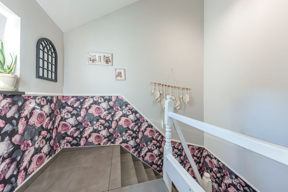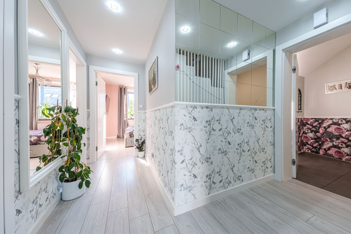 - ściany cekolowane, pomalowane na biało + eleganckie, dodające uroku tapety;