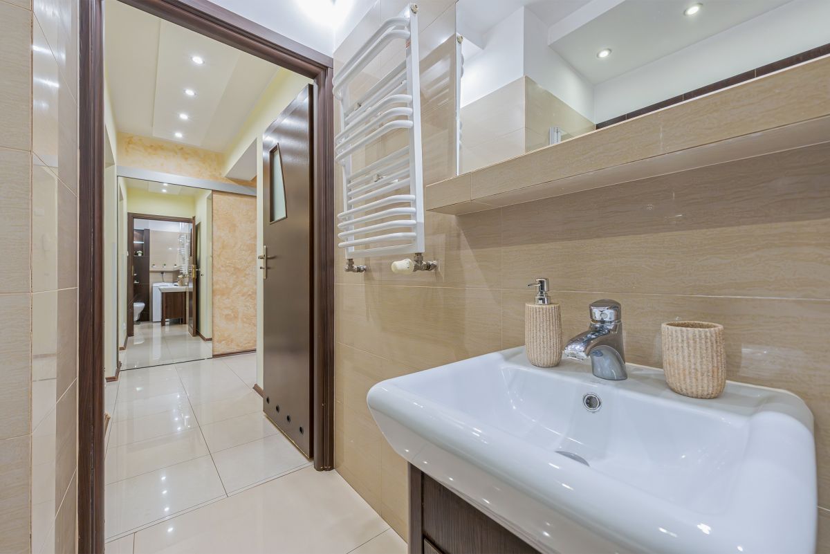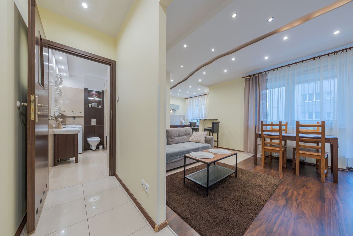 Kuchnia w zabudowie na wymiar, wyposażona w niezbędny sprzęt AGD (lodówkę, zmywarkę, kuchenkę elektryczną, piekarnik oraz okap) W łazience znajduje się pralka. Przemyślany układ mieszkania zapewnia wygodę codziennego użytkowania oraz poczucie przestrzeni.