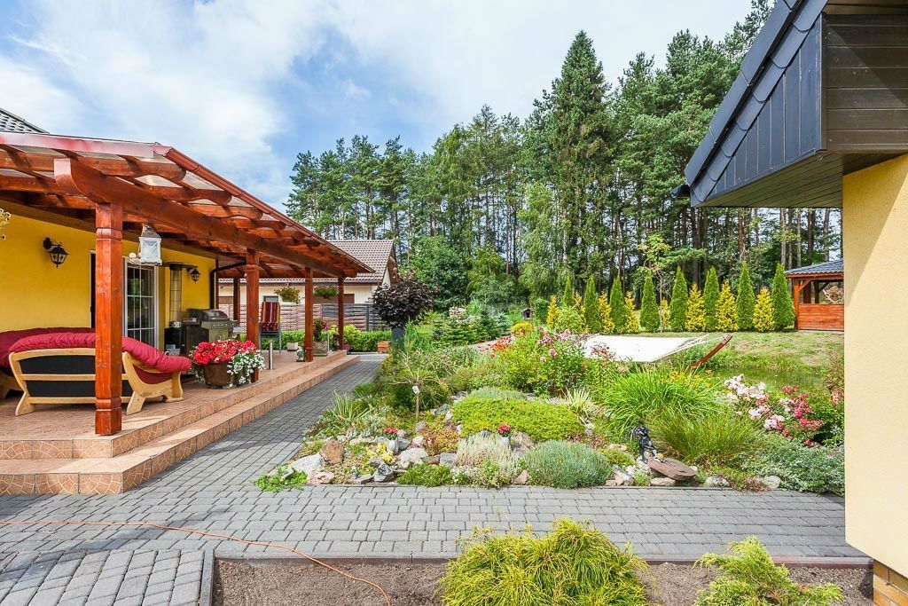 Posesja w całości ogrodzona, wyróżnia się się imponującym, starannie zagospodarowanym, całorocznym ogrodem,  który umożliwia całej rodzinie aktywne spędzanie czasu oraz relaks na świeżym powietrzu. Poza licznymi nasadzeniami, ozdobnymi drzewami oraz kwiatami znaleźć tu można zarybiony staw, wiatę grillową, miejsce na ognisko, jak również prywatny kawałek lasu. Ponadto na posesji znajduje się niezależny budynek stanowiący jednostanowiskowy garaż wraz dodatkowym pomieszczeniem z przeznaczeniem na kotłownię. Wjazd bramą na pilota, utwardzony kostką brukową.