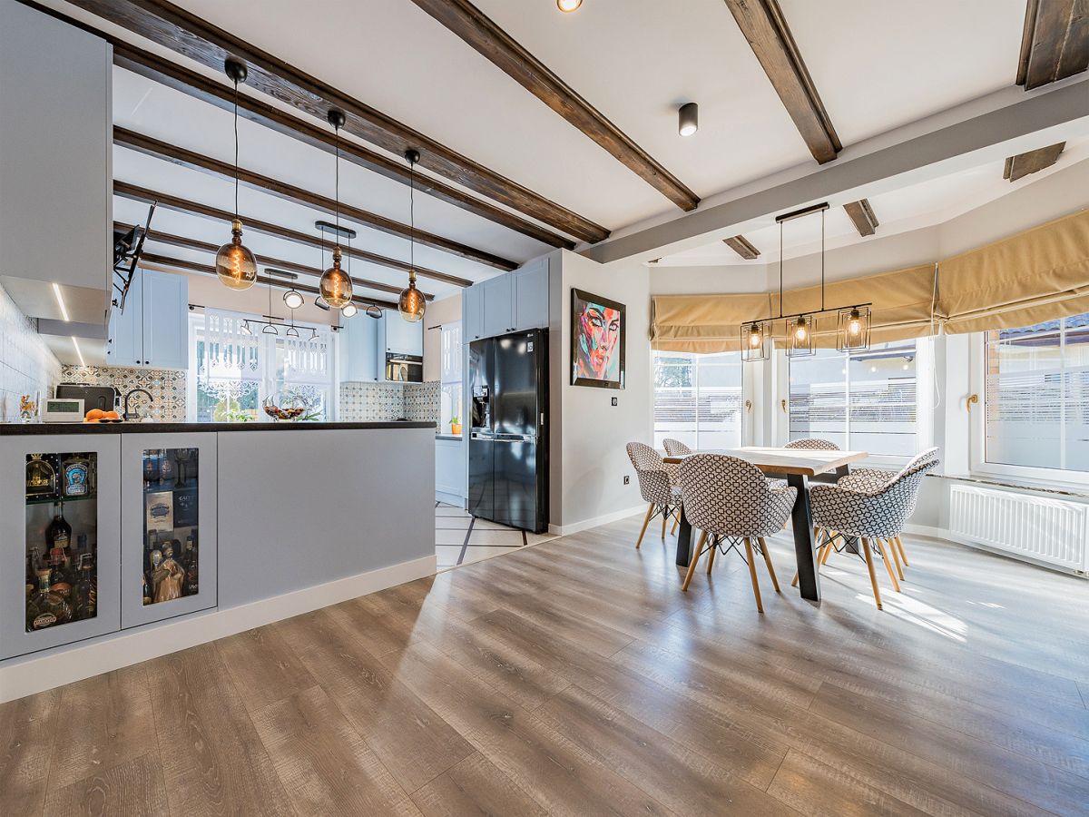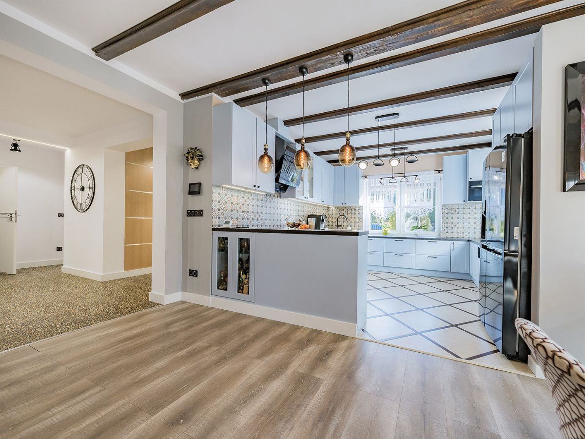 Standard wykończenia : Dom w zeszłym roku przeszedł generalny remont kuchni, łazienki oraz przedpokoju, pozostałe pomieszczenia zostały również całkowicie odświeżone. Kuchnia w eleganckiej zabudowie, wyposażona w wysokiej jakości, nowy sprzęt AGD (lodówka, płyta elektryczna, piekarnik, zmywarka, okap). Łazienka nowoczesna z kabiną prysznicową. W pokojach oraz w przedpokoju pojemne szafy w zabudowie. Na podłodze wysokiej jakości deska z litego drewna (pokoje) oraz kafle (kuchnia, przedpokój). Ściany cekolowane, malowane. Okna PCV z wewnętrznymi żaluzjami. Drzwi zewnętrzne antywłamaniowe. Instalacja alarmowa.