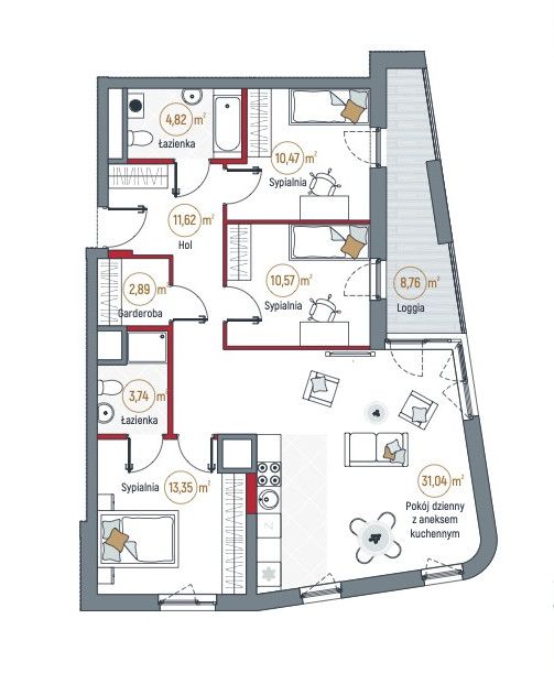 - dwie sypialnie (obie po ok. 10,5 m²) z wyjściem na dużą loggię z widokiem na Gdynię